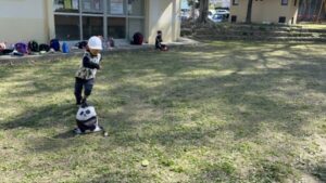 広場でピンクチーム🩷と白チーム🤍に分かれて