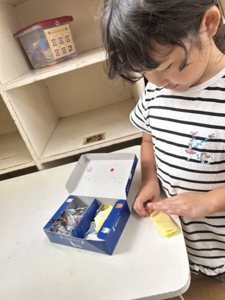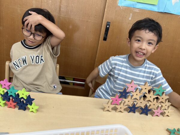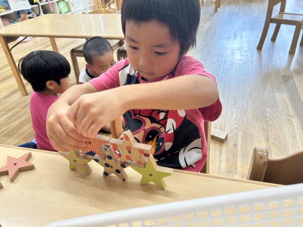 お部屋ではピラミッドづくりや、カスタネット作りなど、それぞれ好きな遊びをしています。