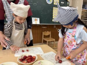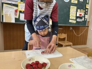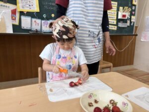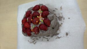 いちごを綺麗に並べるグループやカラーチョコをまんべんなく広げるグループもあり、グループで相談し楽しんみながらケーキ飾りつけを楽しんでいました😊