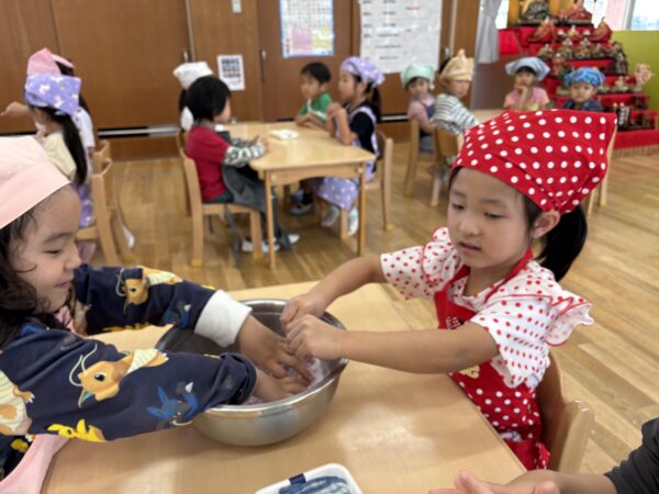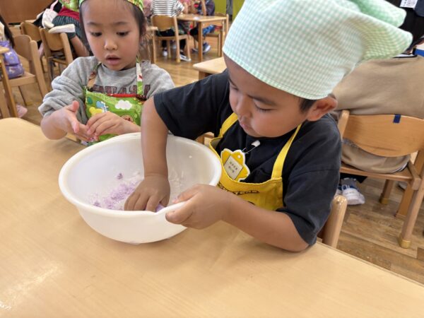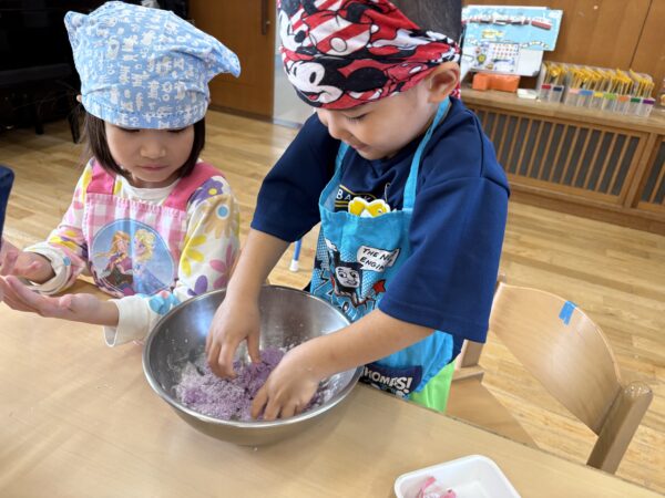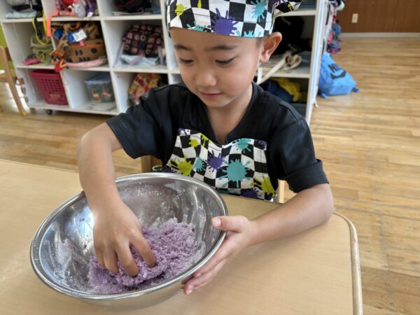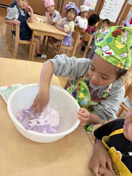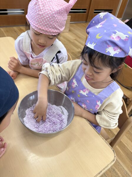 ムーチーの粉を触ってみると「めっちゃサラサラする」「まだムーチーの匂いしないよ」と