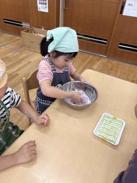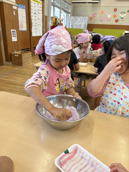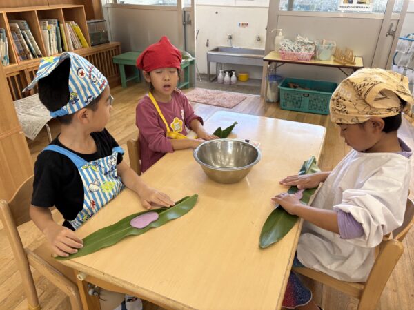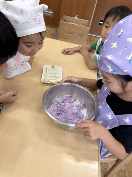 蒸し器に入れると段々といい匂いが、、、「ムーチーの匂いいしてきたー!」「先生もうできた?」と完成を楽しみにしていました😊