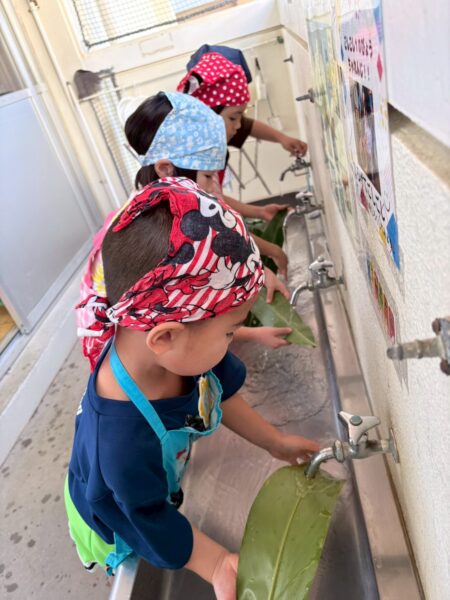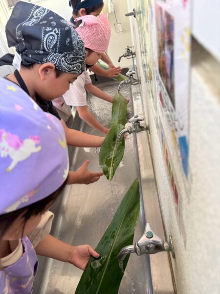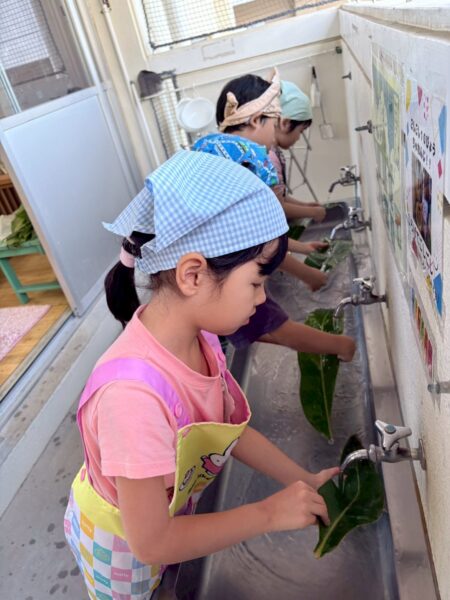 ムーチーの葉を洗うところから始めました!