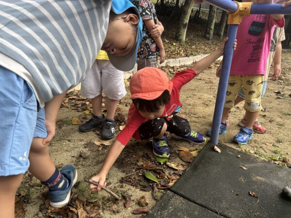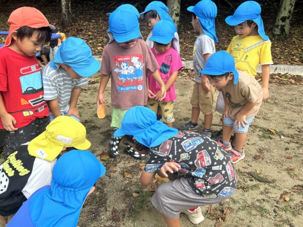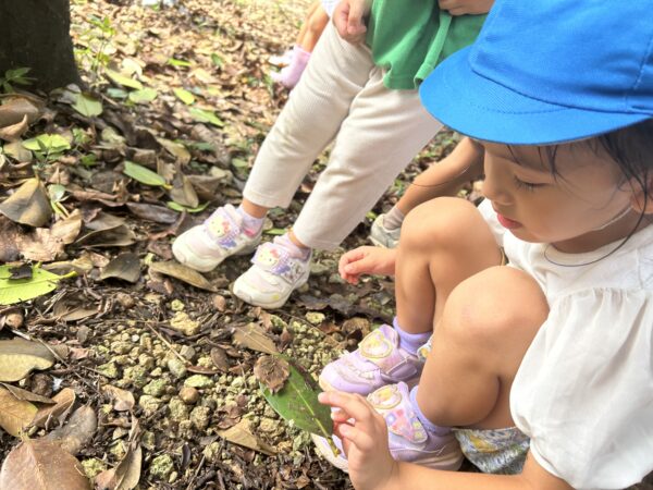 「はじめて見る虫がいる!?」「もしかしてごきぶりの赤ちゃん?」とキャーキャー騒いだりじっと観察しています。雨上がりという事もあり、カエルやありなど沢山の虫がいてびっくり!笑