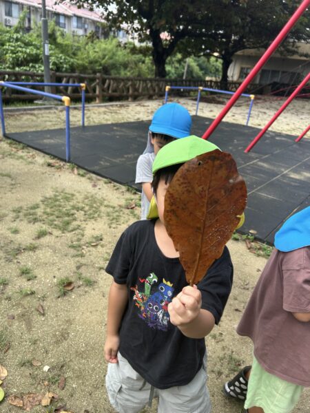 公園につくと、様々な色や形の落ち葉を見つけて拾いました。