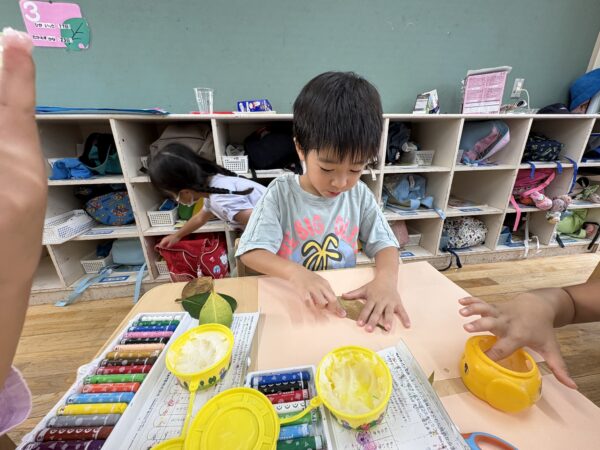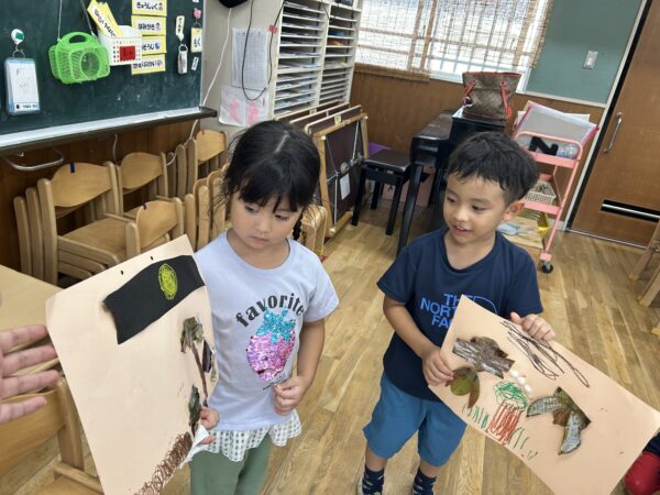 お友だちの作品をみて「私もせみつくろう!」「だったら木もあるよね」「画用紙を切って草も!」とイメージが広がり夢中になって取り組んでいます。