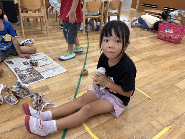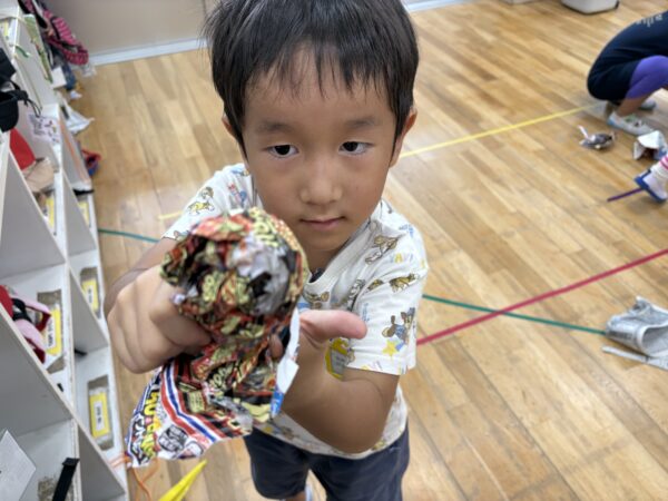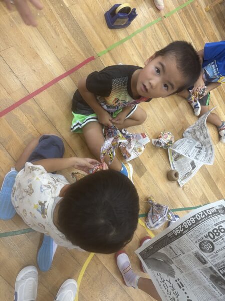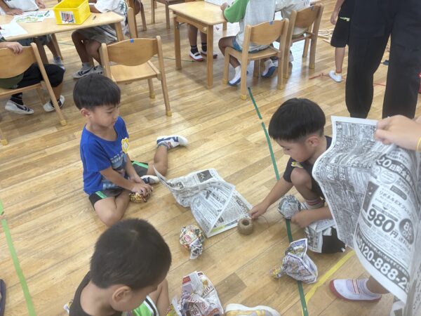 「明日晴れるようにてるてる坊主を作ろう」と新聞紙を使っててるてる坊主が沢山出来上がりました。
