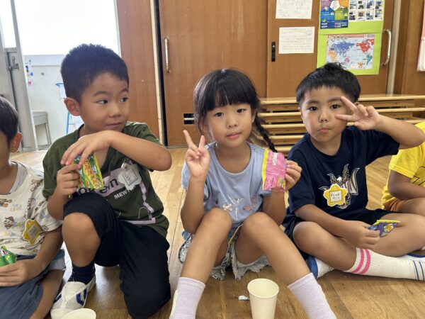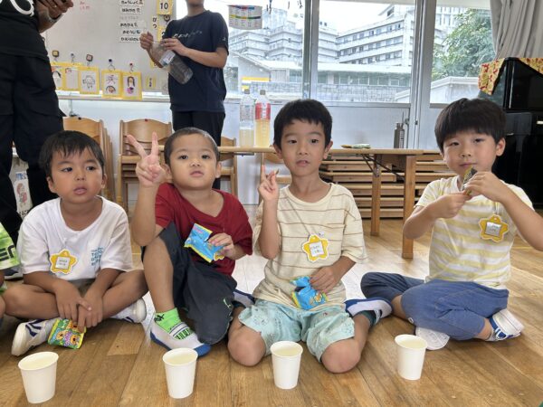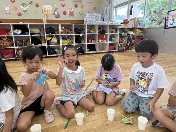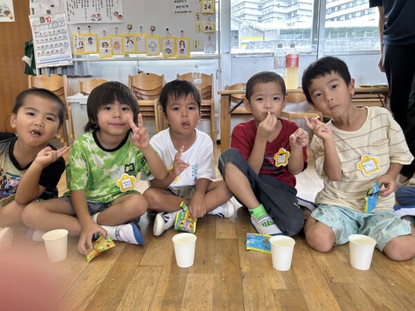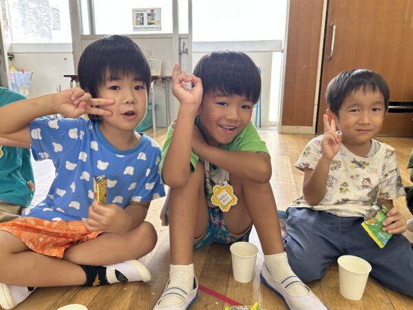 ジュースとお菓子で、「明日頑張るぞーえいえいおー」と乾杯!