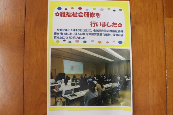 11月30日(日)に雅福祉会の4施設合同の研修を行いました。統括からの規定の説明や、保育業界の情勢、保育の質の向上等について、職員で学びを深めました。