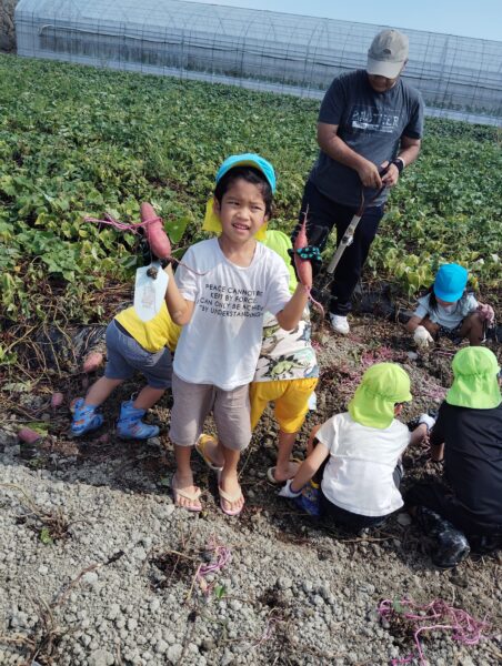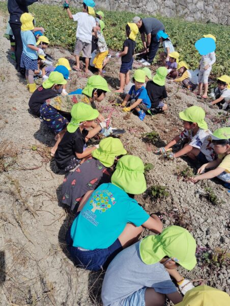 芋は、本当にさくさん取れたので、各家庭にも1家庭4,5歳児には、ビニール袋に入れ、お家でお料理して食べてねと伝えたところ、さっそく次の日には、「てんぷらにしてたべた!」「温めてほかほかのやいもにしてたべた!」等様々教えてくれましよ!!