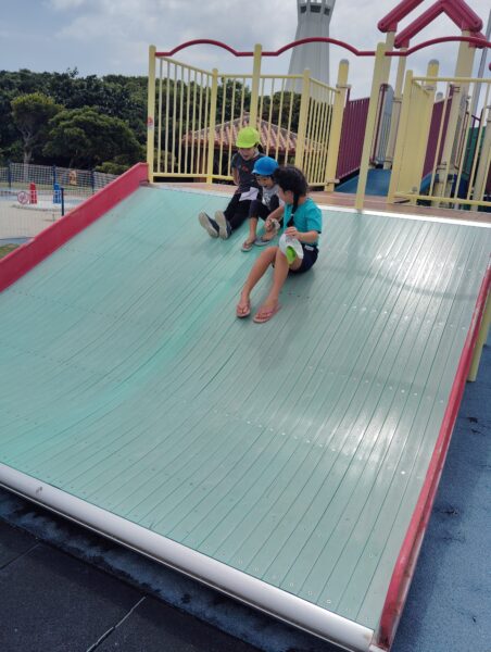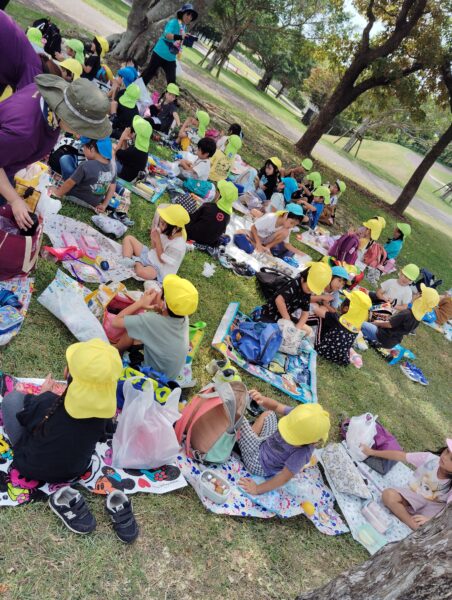 芋掘りで汗をかいた後は、平和祈念公園の遊具がある付近の木の陰でシートを引いてみんなでお弁当を美味しくいただきました。みんな目の前にある遊具を見て、早く食べて遊びたいという気持ちが伝わりました😊