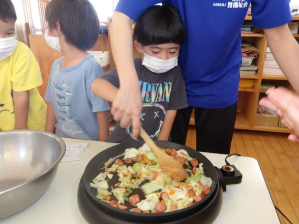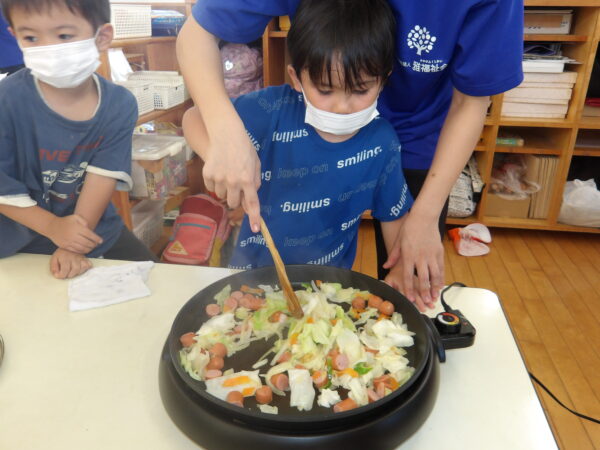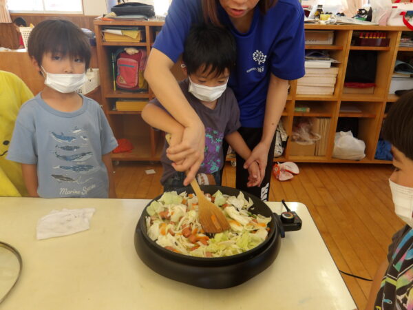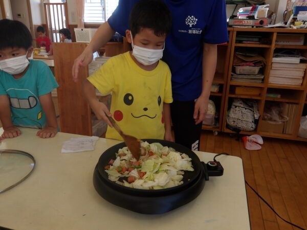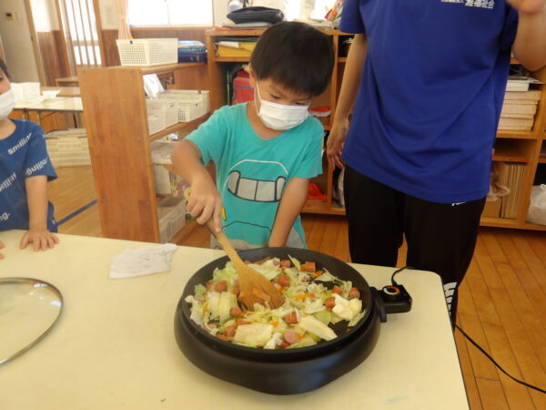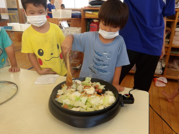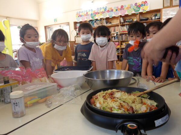 4歳児クラスは、お楽しみ保育だったことで夕飯づくりも開始!今回は、子ども達と行った野菜工場~グリーンフィールドさん~のカット野菜を使った焼きそばづくりをしましたよ♪