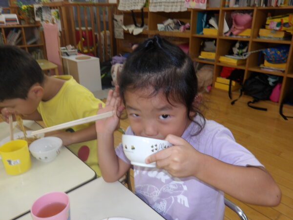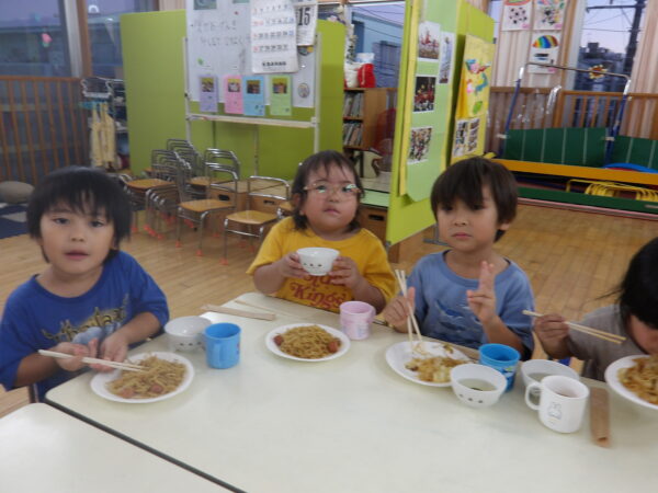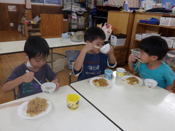 焼きそばとわかめスープ、ゼリーの3品♡自分達で作った味はおいしいね!よくおかわりをするほど、沢山食べていました(*^^*)