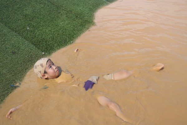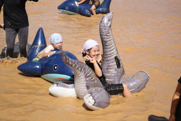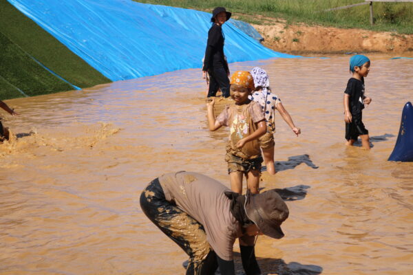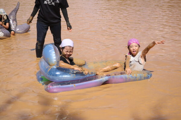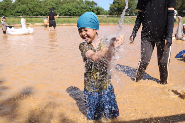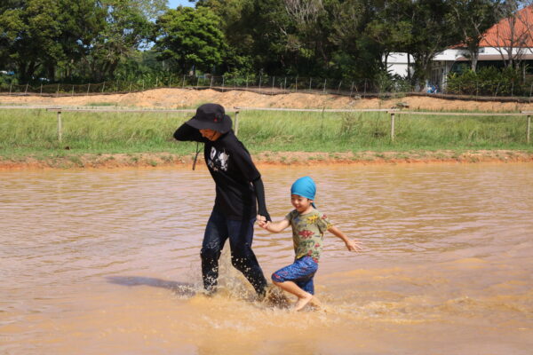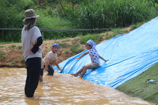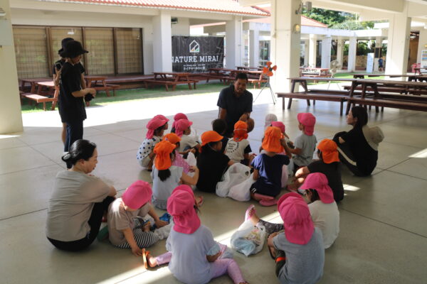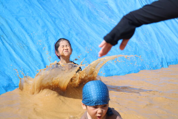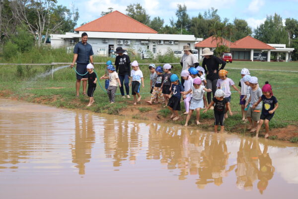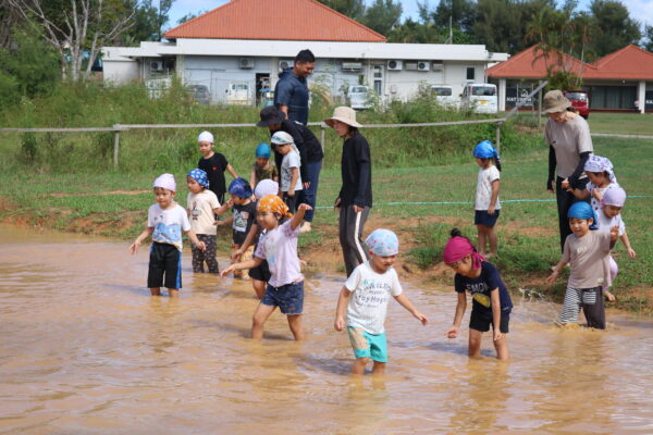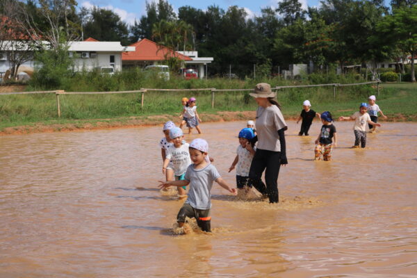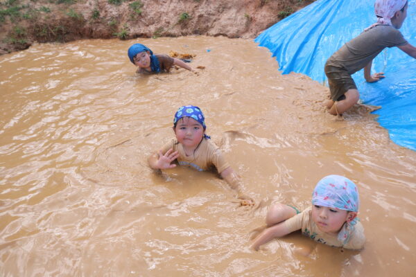 この日は、4・5歳児クラス合同でネイチャーみらい館にて泥遊び体験をしました!5歳児クラスは、最近も田んぼ遊びに行ったり去年も泥遊びをしている経験もあり「楽しみ~!」と楽しみな様子♪ 一方、4歳児クラスは初めての泥遊び体験なので少しドキドキしている子もいました。