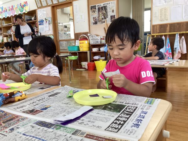 「ハサミの持ち方、こうだった?」とお友達と確認し合いながら慎重に取り組んでいました。