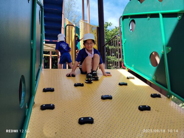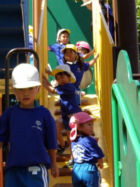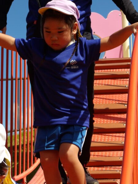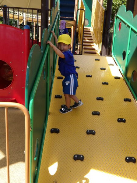 滑り台では、滑るところまで登るのに勇気がいり、初めは躊躇する子も…。
