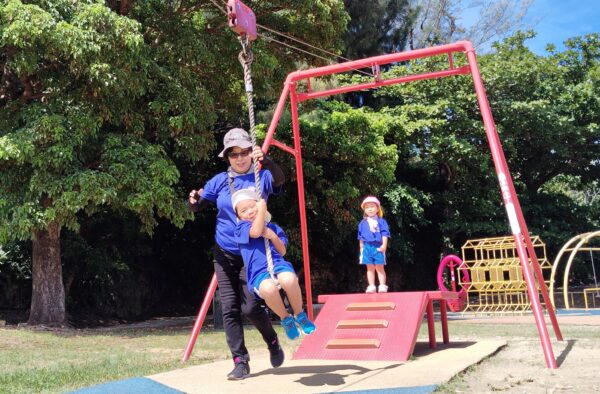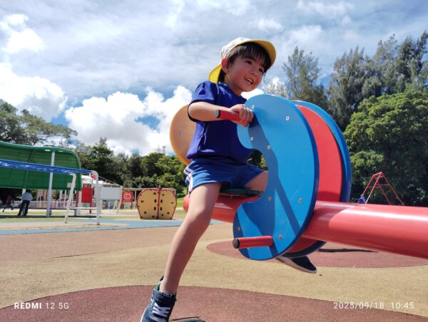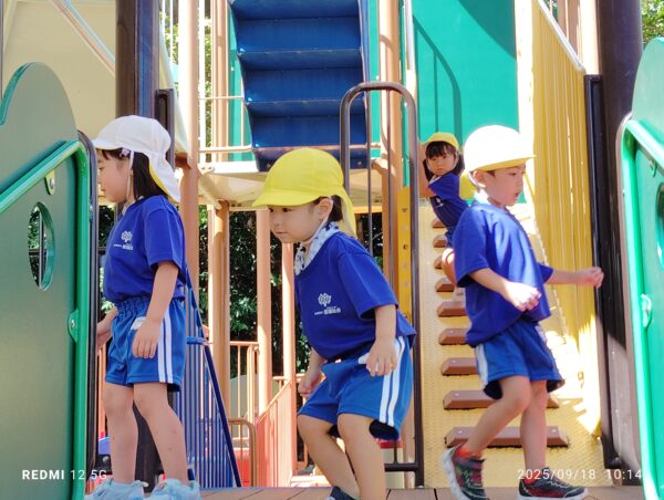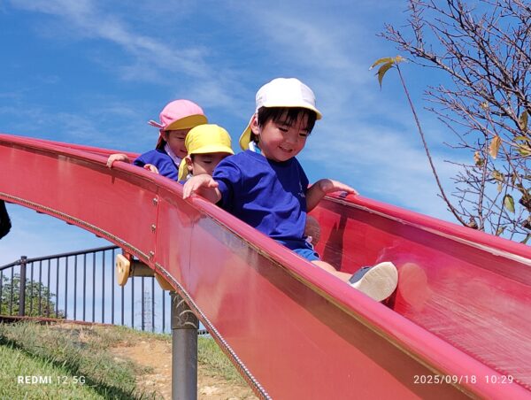 「青色と黒色の遊具は暑くなっているから、触れちゃダメだよ。」と伝えると、お友達同士教え合いながら、しっかりとお約束を守って楽しんでいました。