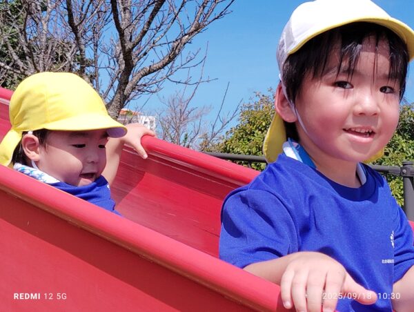 隣の席のお友達と大好きな歌や手遊びを自分達で教え合い、公園までの道のりを楽しむ姿が見られました。