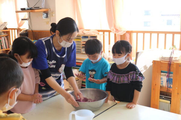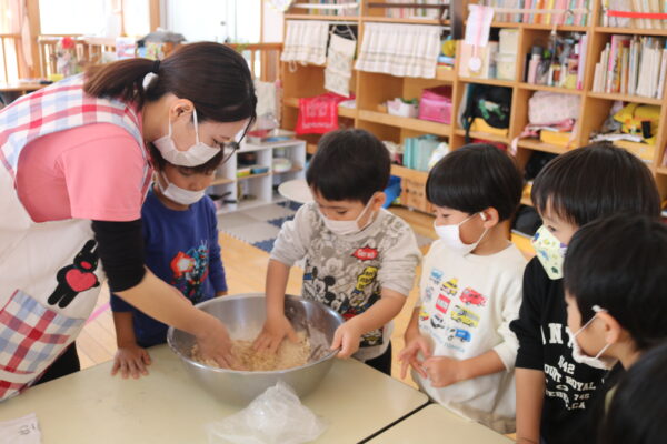 「耳たぶぐらいの柔らかさになるまでこねていくよ」子ども達「これくらいかな?」と考えながら一生懸命にこねていきます。