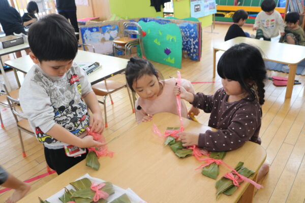 今回は、衛生面や安全面を考慮して食べずにお部屋に吊るしていきました。紐を使って、子ども達と一緒に結んでいきました。