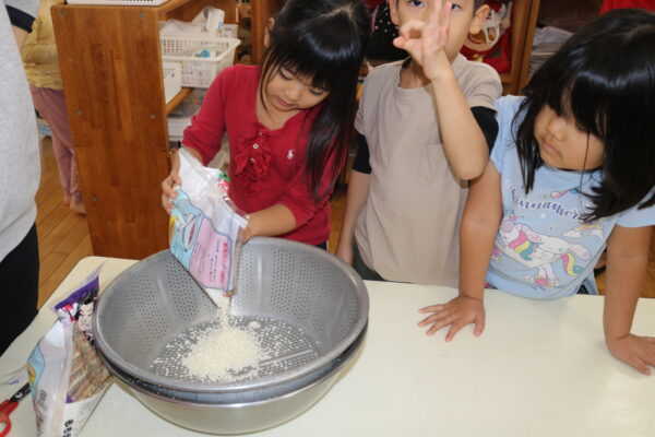 前日からもち米を洗い、水につけて楽しみにしていた子どもたち。