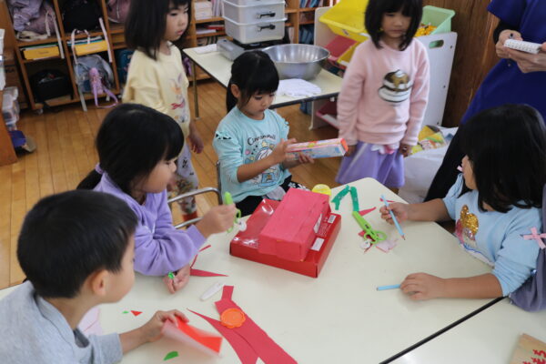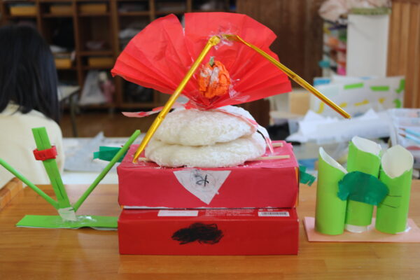 蒸している間は鏡もちの飾りづくり♬絵本を見ながら試行錯誤・・・。
