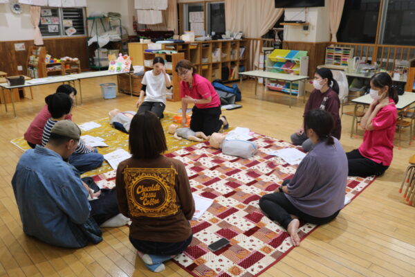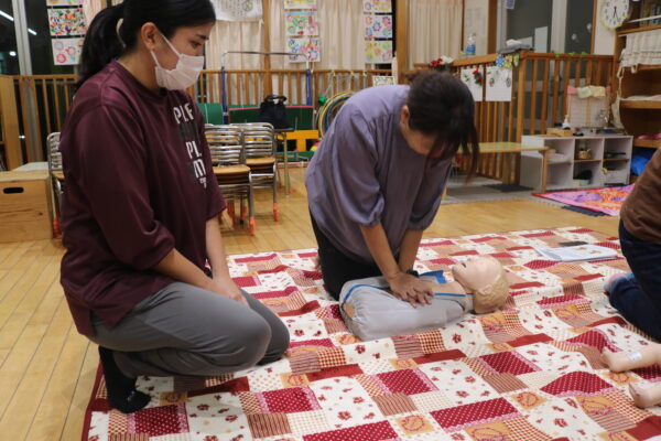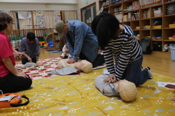 先週は、今年度2回目となる救急救命講習会を開きました。人形を使って、心肺蘇生法やAEDの使い方、異物が入った時の対応方法などを実践していきました。